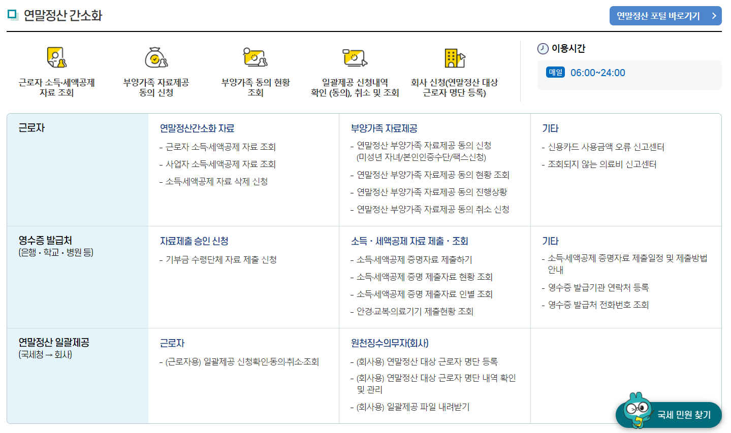최근에는 국세청 홈택스에서 연말정산 간소화 서비스를 통해서 쉽게 연말정산을 쉽게 할 수 있습니다. 간소화 서비스에서 조회되지 않는 자료들이 있는 경우에는 누락된 부분들을 각 발급기관에서 영수증과 같은 증명서류를 직접 발급해서 제출하셔야 합니다.