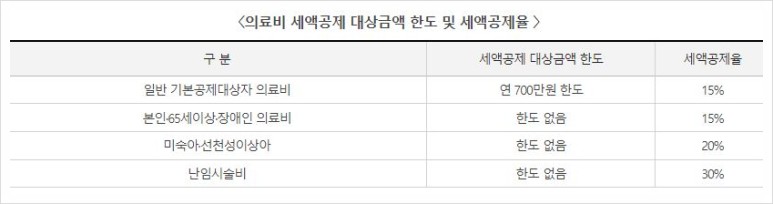 일반 의료비 항목은 세액 공제율 15%, 한도는 700만 원입니다.